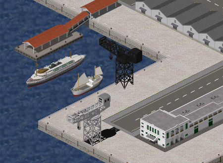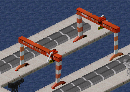 Pak128.Japan標準の港にいくつかの設備を追加するセットです。税関上屋、ハンマーヘッド型起重機、鉄骨造倉庫、浮桟橋が追加されます。