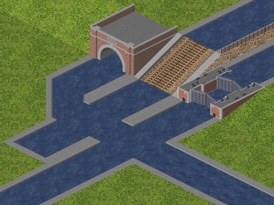 運河と運河用の煉瓦隧道です。現状Pak128.Japanには運河がないので作ってみました。平水区域の船舶向けで、最高速度は15km/hです。斜面部は閘門とインクラインで表現しています。120.0以降の緩急坂対応ですが、以前のバージョン用も同梱(oldslopeフォルダ内)しています。水面部分等はyoshiさんの公式ソースをお借りしました。