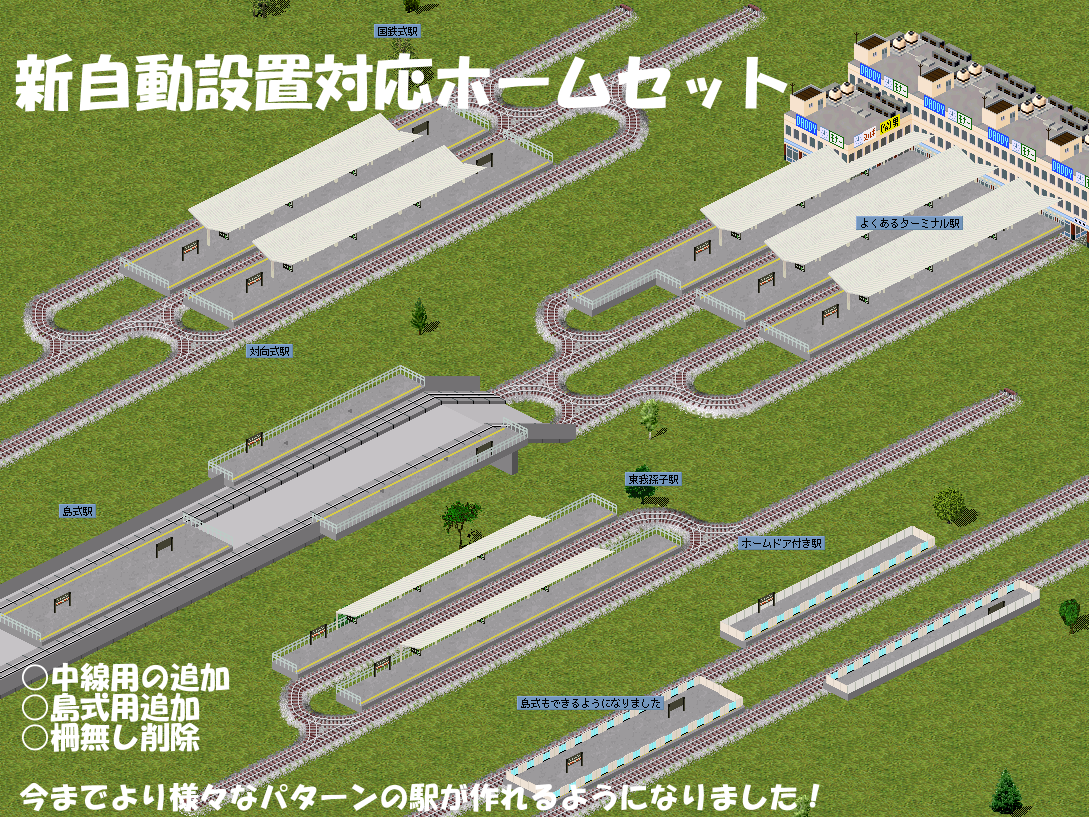 | 片面式の日本風プラットホームです。 屋根つき、屋根つき(ローカル線向け)、屋根なしの3種類が入ってます。 'front'があるものは線路より手前側に、'back'があるものは線路より奥側に作られます。 | ||